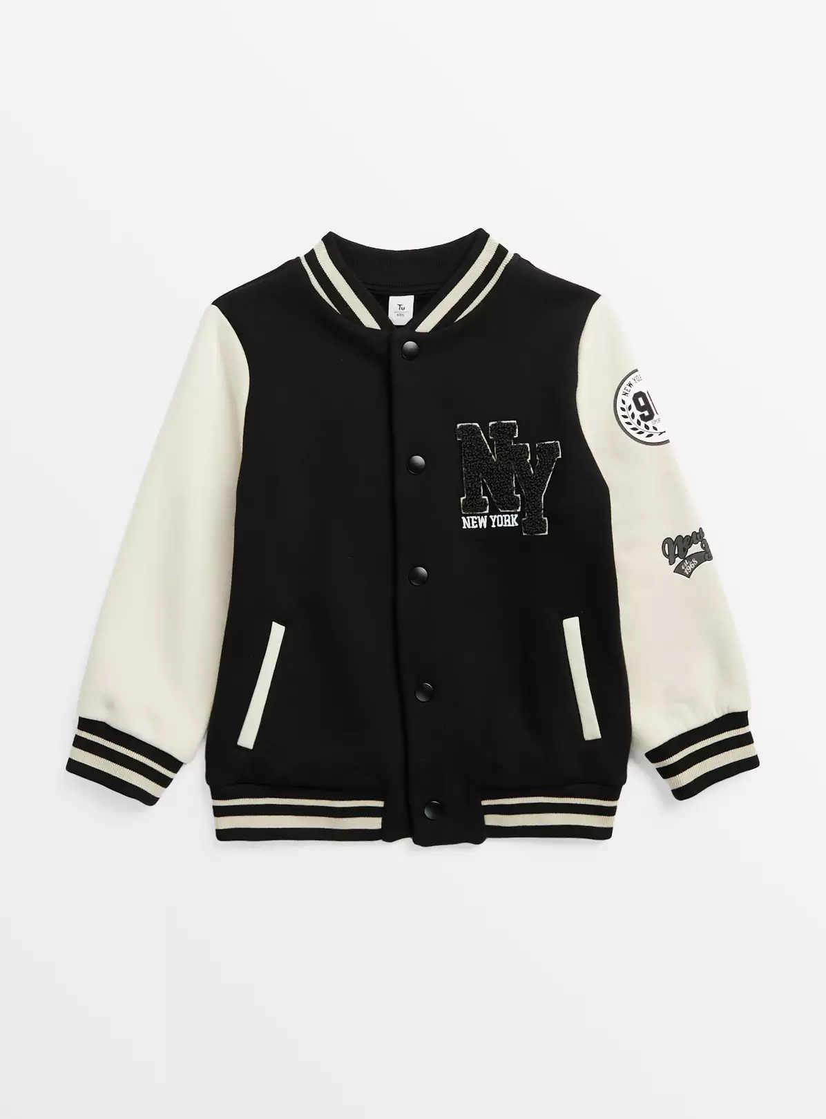 Boost their mini wardrobe with this Varsity inspired black baseball jacket. Designed with appliqué details, colour block styling and handy side pockets, it has a stretchy stripe ribbed neck, cuffs and hem for comfort. They will love wearing this trendy number!