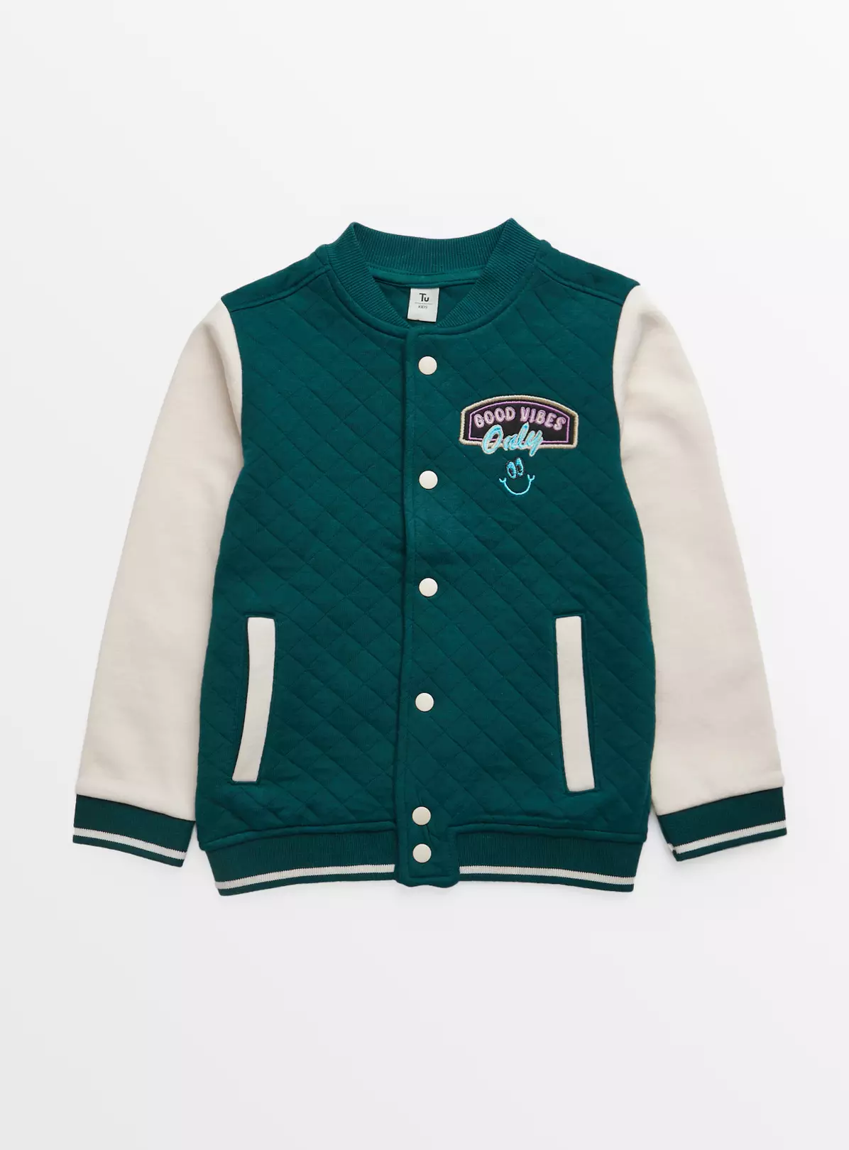 Boost their mini wardrobe with this varsity inspired teal bomber jacket. Designed with a cool embroidered detail on the front, it comes in a quilted design for a comfy fit. In a versatile teal shade, it looks great paired with denim jeans.